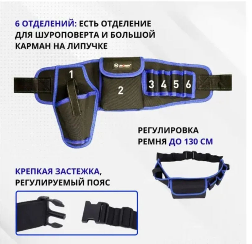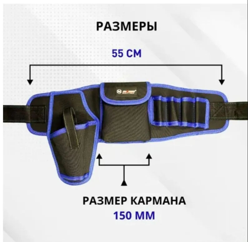 Сумка-пояс для инструментов с ремнем 150 см имеет 4 открытых отсека и один большой карман на липучке, а также карман для шуруповерта. Внимание! пояс пошит с запасом ремня для крупных мужчин в условиях зимних работ в бушлате! Т.е. ремешок возможно придется подгонять под талию.